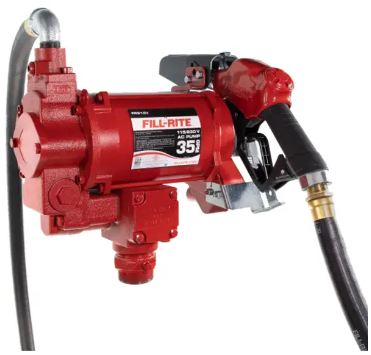 El modelo FR310VB es una bomba de transferencia de combustible de alta resistencia de 230V CA y 113 LPM. Este conjunto de bomba y accesorios incluye una manguera, pistola automática y componentes de instalación.